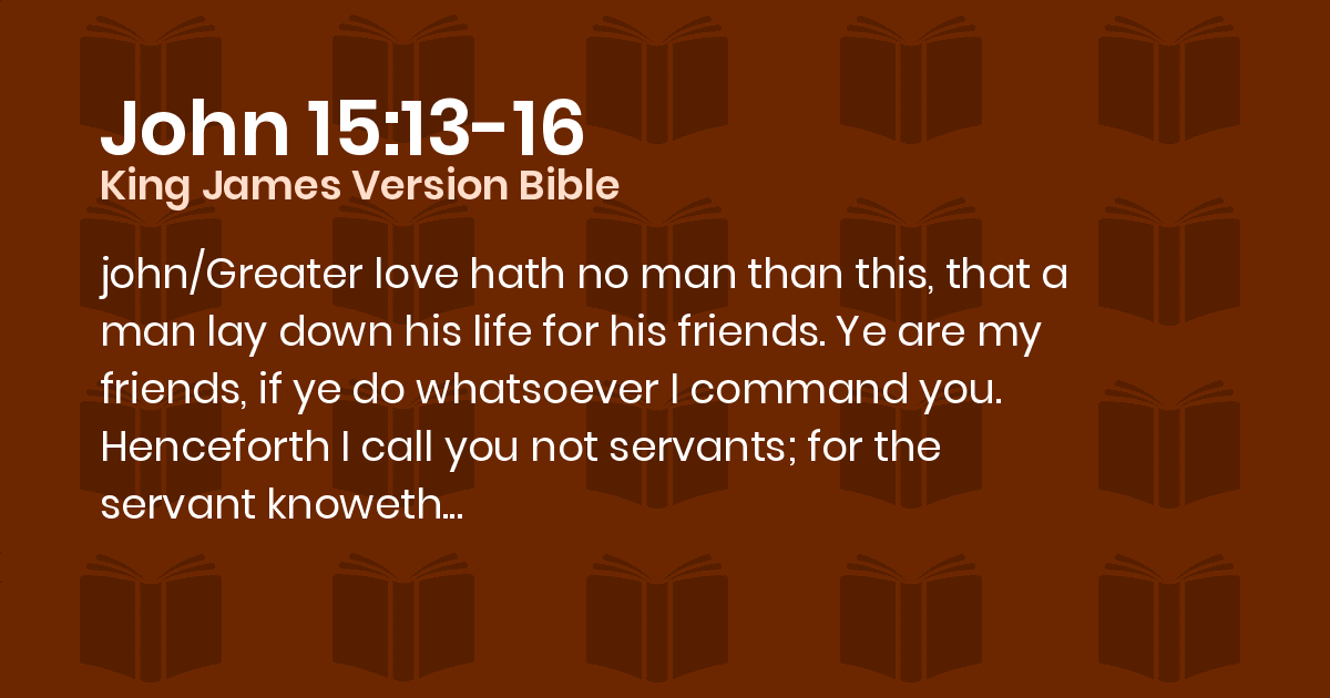 John 15 KJV | Greater Love has No One than This, Read by Rev Dan Wagner Bible Version: King James Version Text: Public domain Audio: (C) 1999 Talking Bibles. . We Have got 7 pix about No Greater Love Kjv images, photos, pictures, backgrounds, and more. In such page, we additionally have number of images out there. Such as png, jpg, animated gifs, pic art, symbol, blackandwhite, pics, etc. "ENCOURAGING SCRIPTURES WITH MUSIC (8 HOURS) , ENCOURAGING SCRIPTURES WITH MUSIC (8 HOURS) | KJV Bible Verses For Sleep, Peace, Protection (SOAKING . "HEALING SCRIPTURES from the Holy Bible (KJV)", HEALING SCRIPTURES from the Holy Bible (KJV) The scriptures are presented to build your faith for healing. The Bible states:- ..